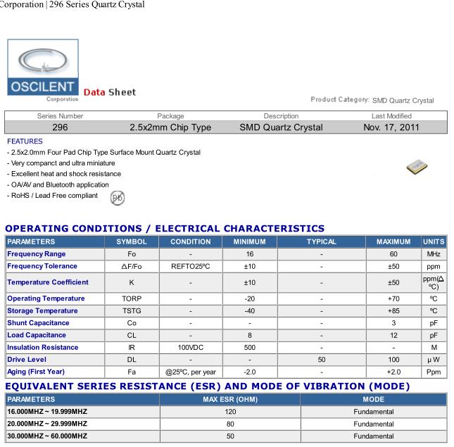 奧斯康利晶振,296-25.0M-9-20-G-S-TR晶振,SMD晶振,小型貼片石英晶振,外觀尺寸具有薄型表面貼片型石英晶體振蕩器,特別適用于有小型化要求的市場領域,比如智能手機,無線藍牙,平板電腦等電子數(shù)碼產品.晶振本身超小型,薄型,重量輕,晶體具有優(yōu)良的耐環(huán)境特性,如耐熱性,耐沖擊性,在辦公自動化,家電相關電器領域及Bluetooth,WirelessLAN等短距離無線通信領域可發(fā)揮優(yōu)良的電氣特性,滿足無鉛焊接的回流溫度曲線要求.