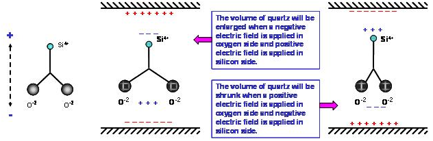 石英材料中的二氧化硅分子(SiO2) 在正常狀態下, 其電偶極是互相平衡的電中性. 在(如上圖)的二氧化硅是以二維空間的簡化圖形. 當我們在硅原子上方及氧原子下方分別給予正電場及負電場時, 空間系統為了維持電位平衡, 兩個氧原子會相互排斥, 在氧原子下方形成一個感應正電場區域, 同時在硅原子上方產生感應負電場區域. 相反的情況, 當我們在硅原子上方及氧原子下方分別給予負電場及正電場時, 兩個氧原子會相互靠近, 氧原子下方產生感應負電場,硅原子上方產生感應正電場.