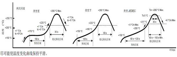 將晶振加熱包裝材料至+150°C以上會破壞產品特性或損害產品。如需在+150°C以上焊接石英晶振,建議使用SMD晶振產品。在下列回流條件下,對石英晶振產品甚至SMD晶振使用更高溫度,會破壞晶振特性。建議使用下列配置情況的回流條件。安裝這些貼片晶振之前,應檢查焊接溫度和時間。同時,在安裝條件更改的情況下,請再次進行檢查。如果需要焊接的晶振產品在下列配置條件下進行焊接,請聯系我們以獲取耐熱的相關信息。